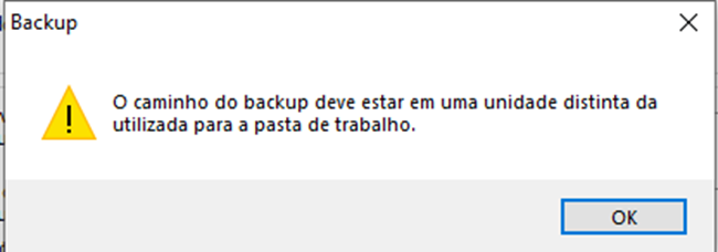do backup deve estar em uma unidade de disco diferente do caminho da Pasta de Trabalho.