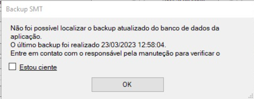 Caso o sistema não esteja realizando o backup automaticamente, irá apresentar uma mensagem informando que não foi possível localizar o backup atualizado e informará a data que foi realizado o ultimo backup. Segue exemplo: