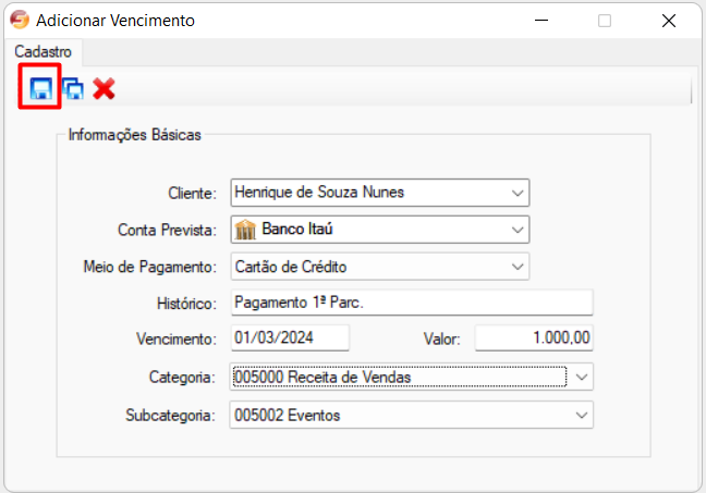 Exemplo: O evento foi parcelado em 3x sendo 1º vencimento no valor de R$ 1.000,00 o