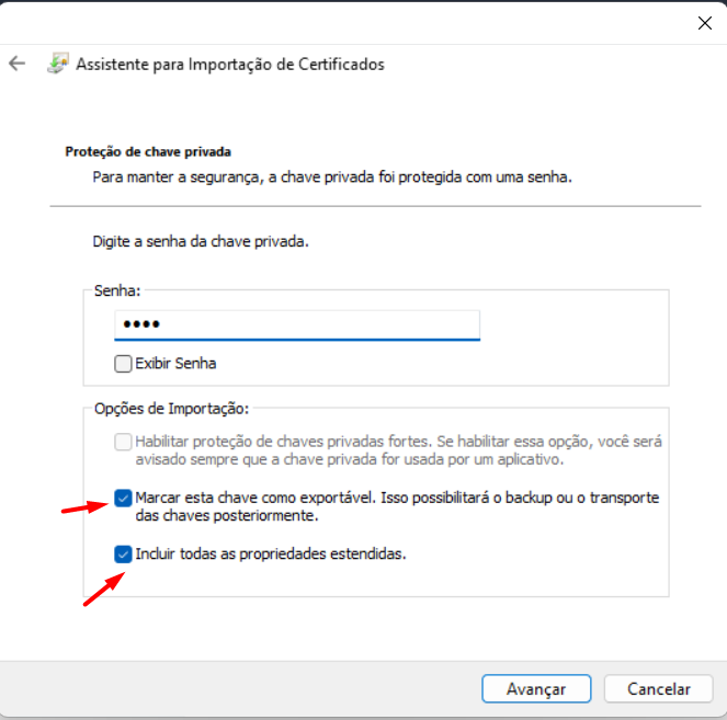 10. Digite a Senha do seu Certificado Digital e marque as duas ultimas opções de Opções de Importação