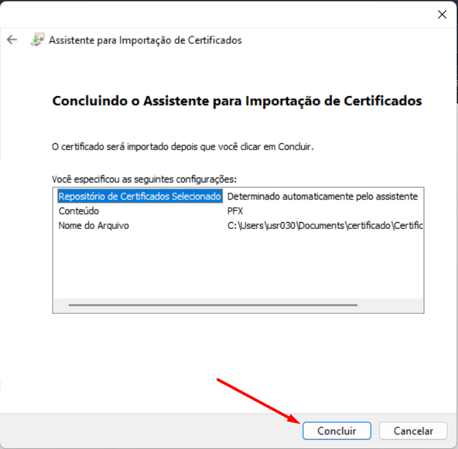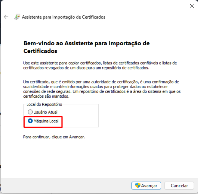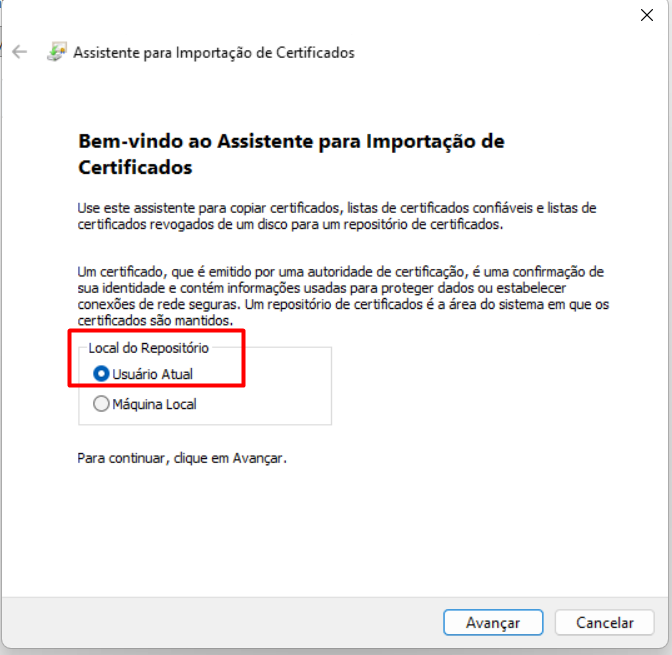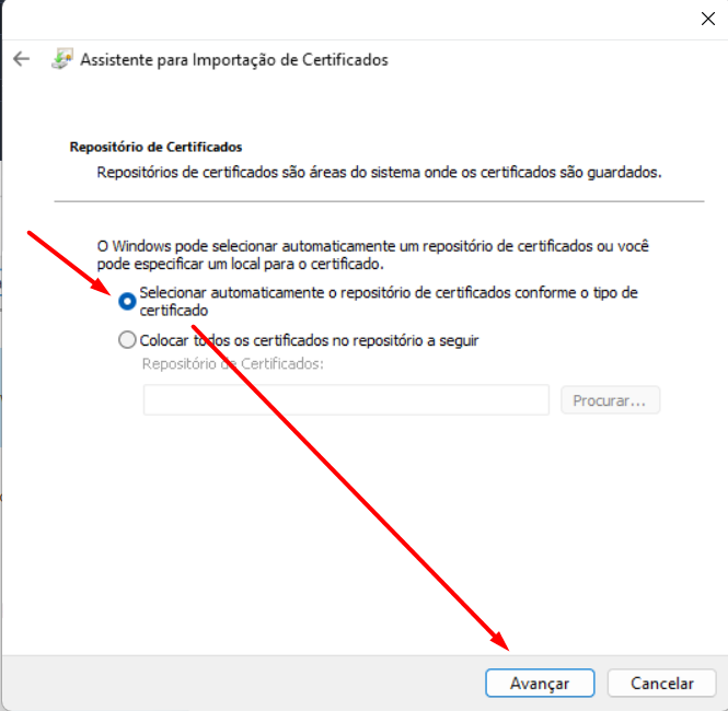 11. Após as opções de importação, uma tela de localização do certificado no sistema será exibida, basta apenas prosseguir, não é necessário alterar nada.