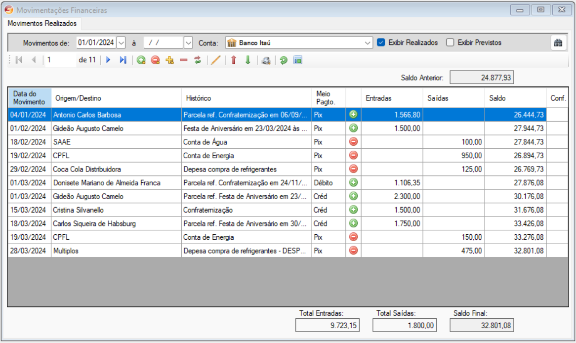 Na Movimentação Financeira é possível verificar todas entradas (receita) e saídas (despesa) de suas contas financeiras cadastradas.