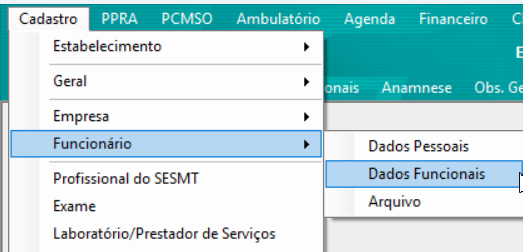 Na tela dos Dados Funcionais, são realizados os cadastros dos vínculos dos Funcionários à Empresa. Aqui, você informa o Tipo de Registro, a Empresa, o Ambiente de Trabalho, a Função e o Setor Administrativo do funcionário. 1. Acesse o menu Cadastro > ...